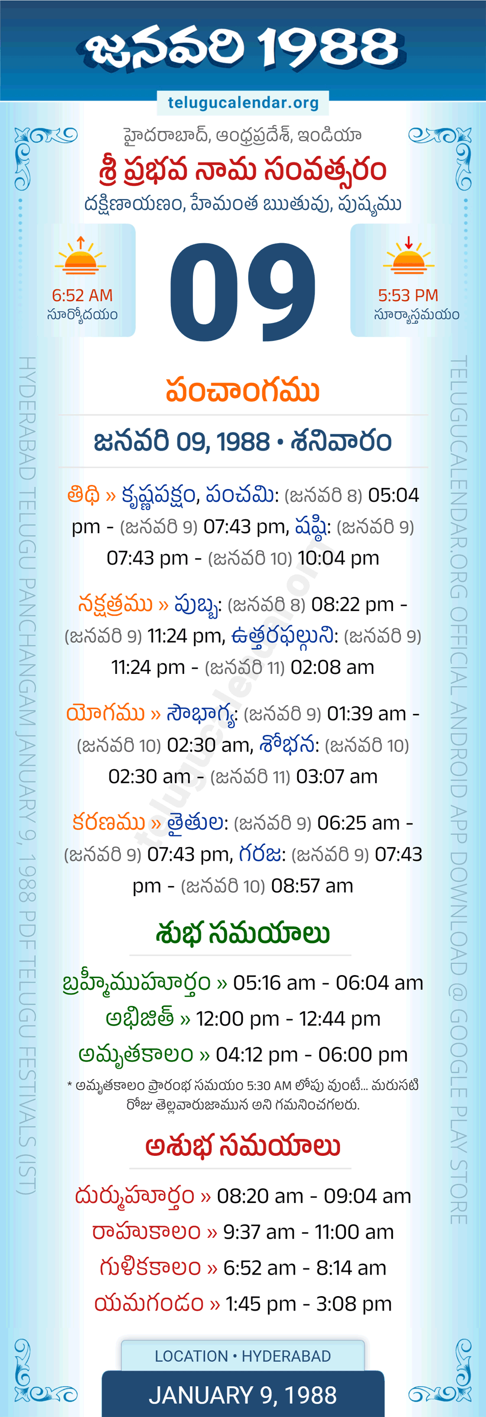 Download » January 9, 1988 » Hyderabad, Andhra Pradesh Telugu Calendar Panchangam Daily Sheet with Auspicious and Inauspicious Timings.