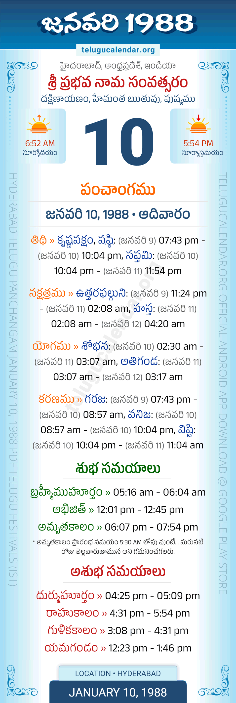 Download » January 10, 1988 » Hyderabad, Andhra Pradesh Telugu Calendar Panchangam Daily Sheet with Auspicious and Inauspicious Timings.
