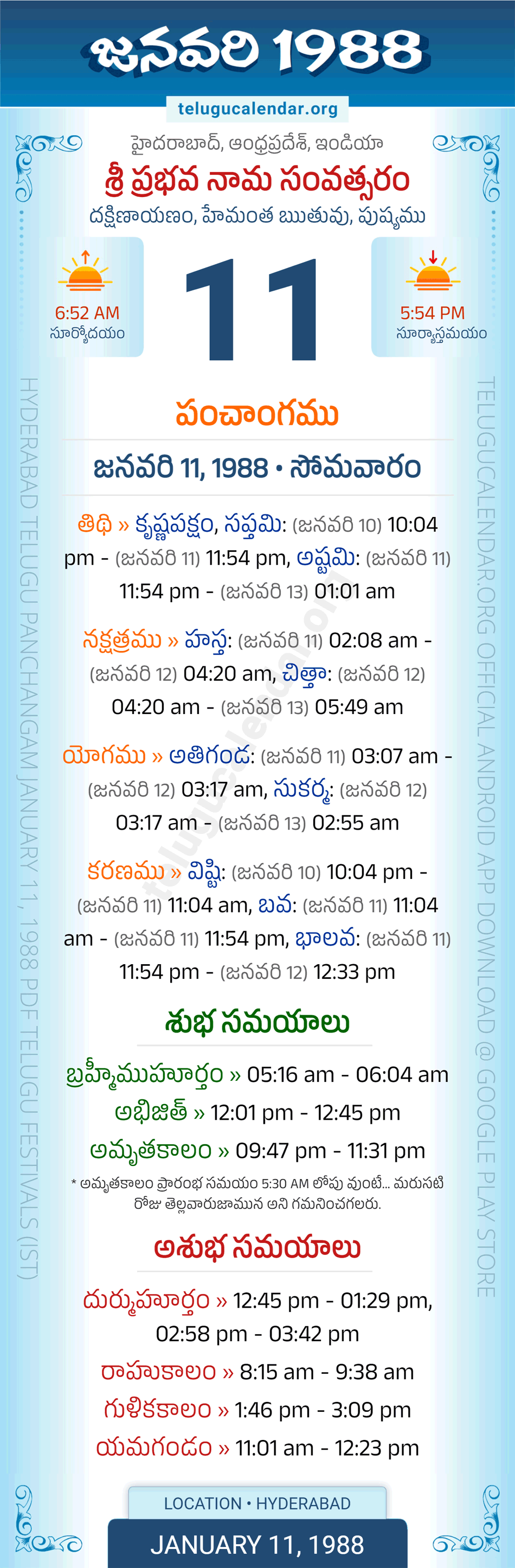 Download » January 11, 1988 » Hyderabad, Andhra Pradesh Telugu Calendar Panchangam Daily Sheet with Auspicious and Inauspicious Timings.