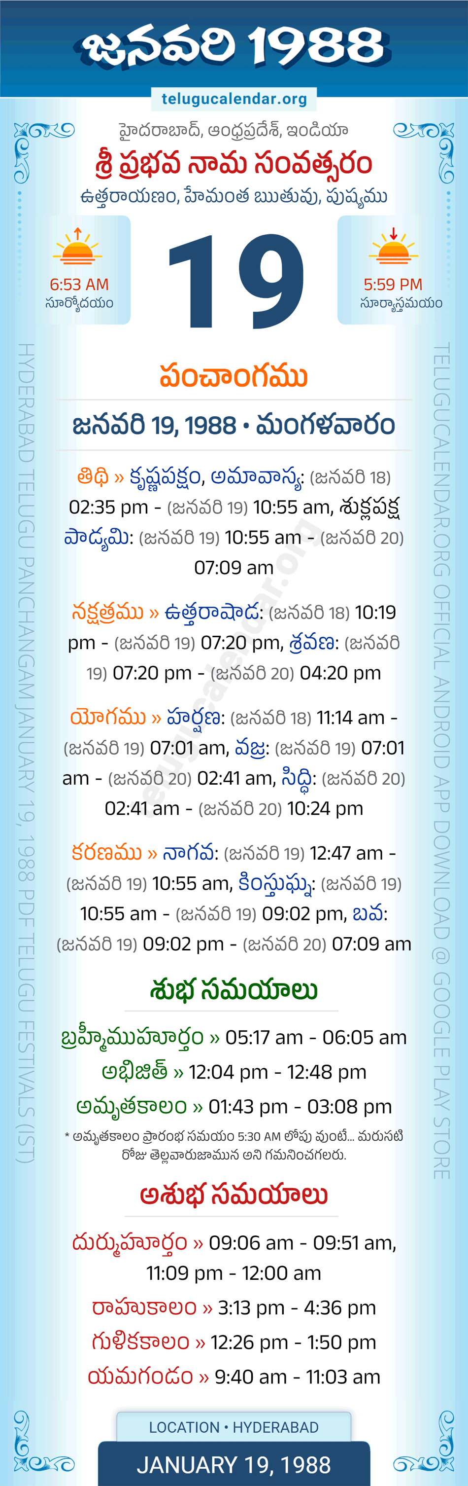 Download » January 19, 1988 » Hyderabad, Andhra Pradesh Telugu Calendar Panchangam Daily Sheet with Auspicious and Inauspicious Timings.