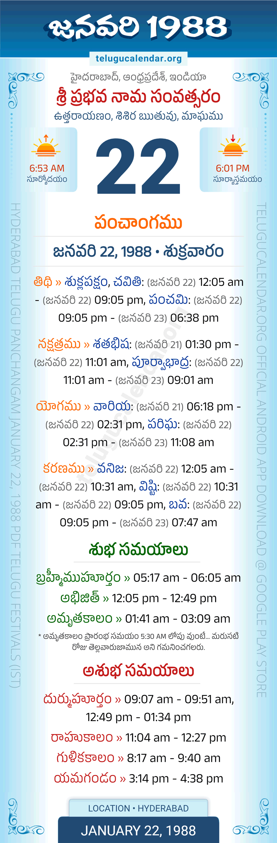 Apart from the Panchangam 1988, you can also find the Sunrise and Sunset (Middle Limb) timings, Paksham, Telugu Year, Yanam, Rutuvu, Telugu Month for Hyderabad. Auspicious Period January 22, 1988 for Hyderabad (Today Good Timings like Abhijit Muhurtham, Amruta Kalam & Brahma Muhurtham) and Inauspicious Period January 22, 1988 for Hyderabad (Bad Timings like Durmuhurtham, Rahukalam, Gulika kalam & Yamagandam) with starting and end timings in the above image in Telugu Language.