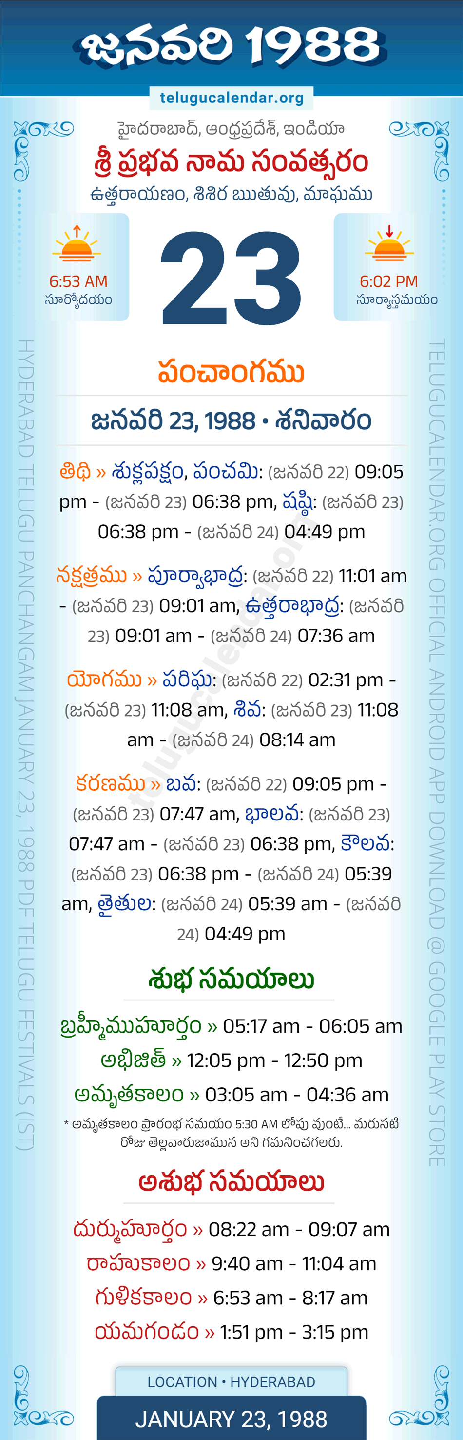 Apart from the Panchangam 1988, you can also find the Sunrise and Sunset (Middle Limb) timings, Paksham, Telugu Year, Yanam, Rutuvu, Telugu Month for Hyderabad. Auspicious Period January 23, 1988 for Hyderabad (Today Good Timings like Abhijit Muhurtham, Amruta Kalam & Brahma Muhurtham) and Inauspicious Period January 23, 1988 for Hyderabad (Bad Timings like Durmuhurtham, Rahukalam, Gulika kalam & Yamagandam) with starting and end timings in the above image in Telugu Language.
