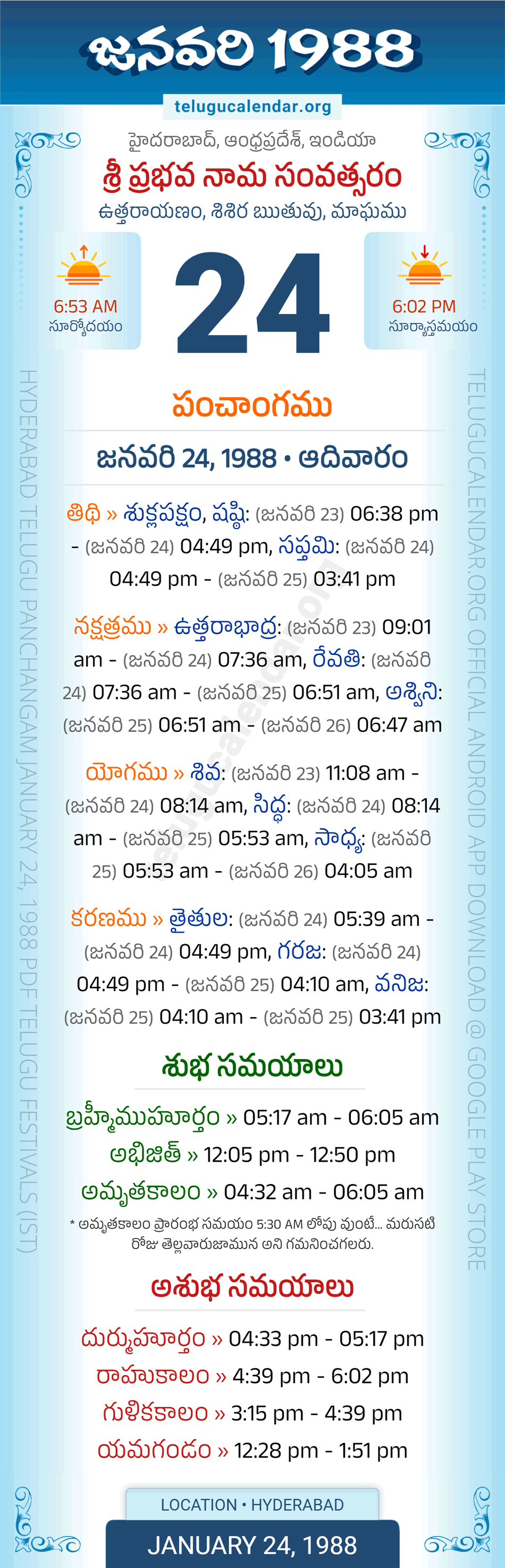 Download » January 24, 1988 » Hyderabad, Andhra Pradesh Telugu Calendar Panchangam Daily Sheet with Auspicious and Inauspicious Timings.