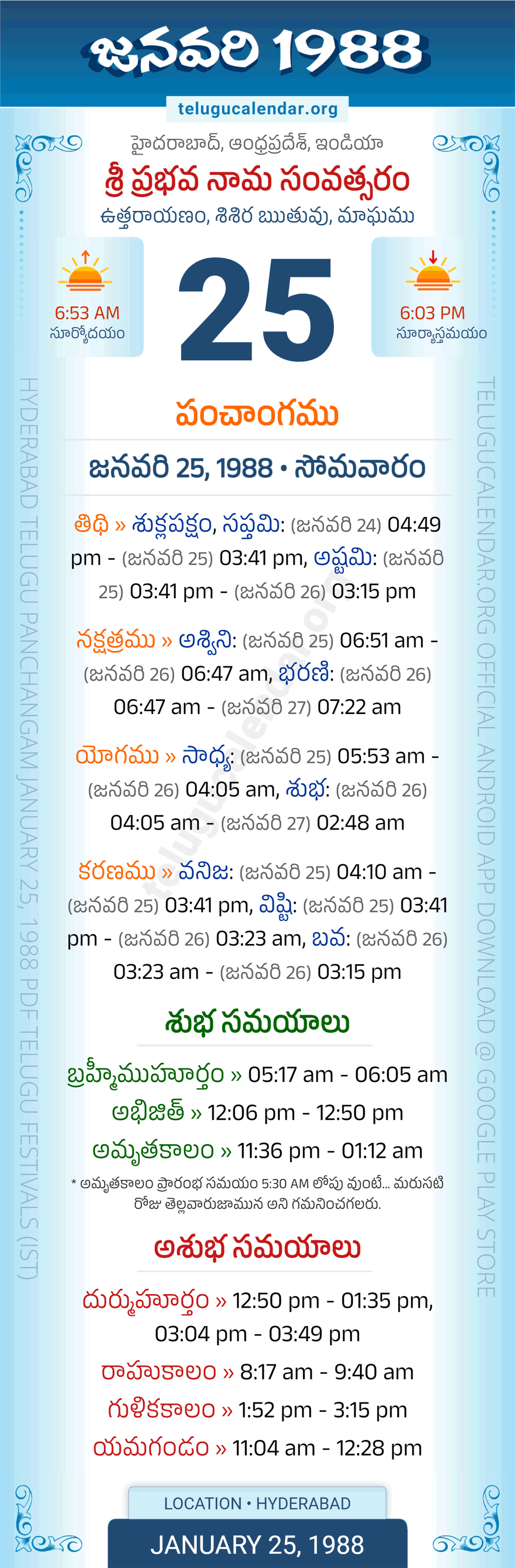 Download » January 25, 1988 » Hyderabad, Andhra Pradesh Telugu Calendar Panchangam Daily Sheet with Auspicious and Inauspicious Timings.
