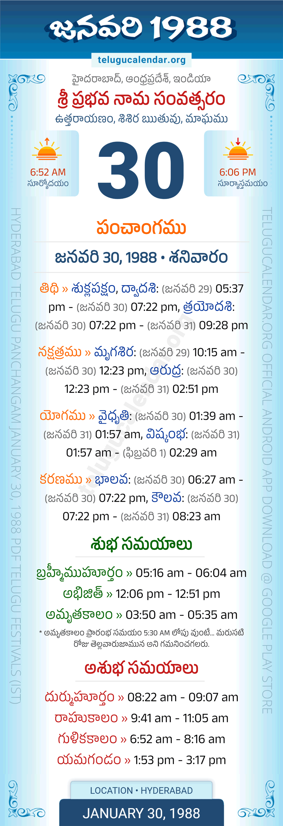 Download » January 30, 1988 » Hyderabad, Andhra Pradesh Telugu Calendar Panchangam Daily Sheet with Auspicious and Inauspicious Timings.