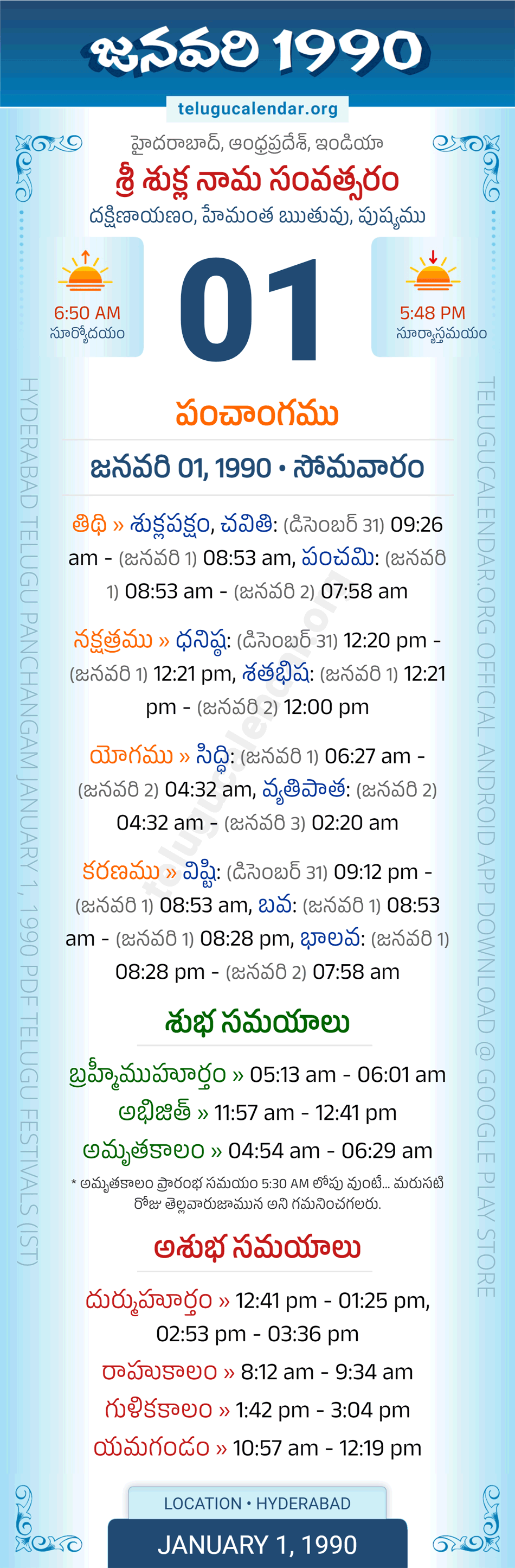 Download » January 1, 1990 » Hyderabad, Andhra Pradesh Telugu Calendar Panchangam Daily Sheet with Auspicious and Inauspicious Timings.