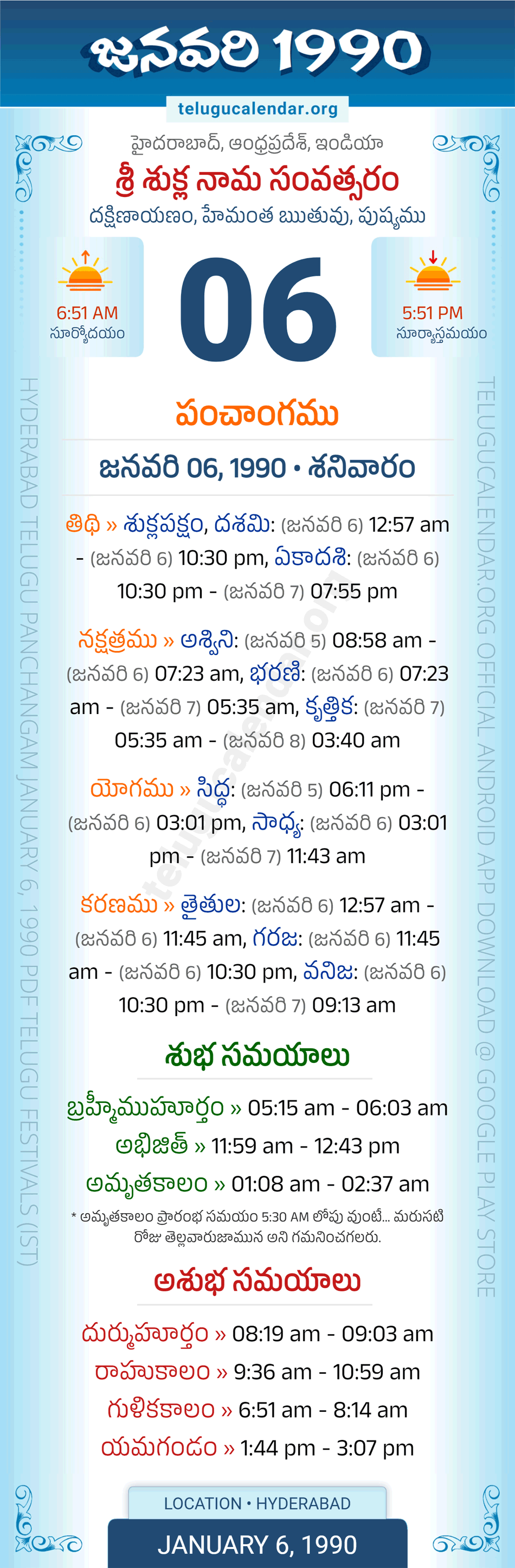 Download » January 6, 1990 » Hyderabad, Andhra Pradesh Telugu Calendar Panchangam Daily Sheet with Auspicious and Inauspicious Timings.