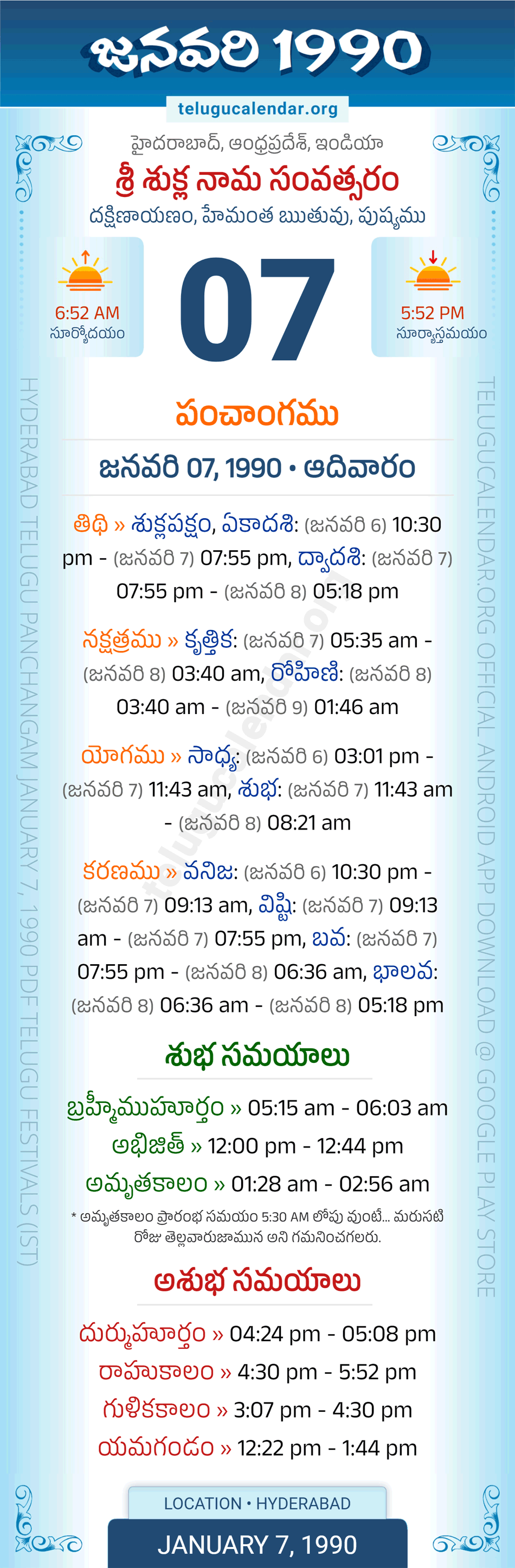 Download » January 7, 1990 » Hyderabad, Andhra Pradesh Telugu Calendar Panchangam Daily Sheet with Auspicious and Inauspicious Timings.