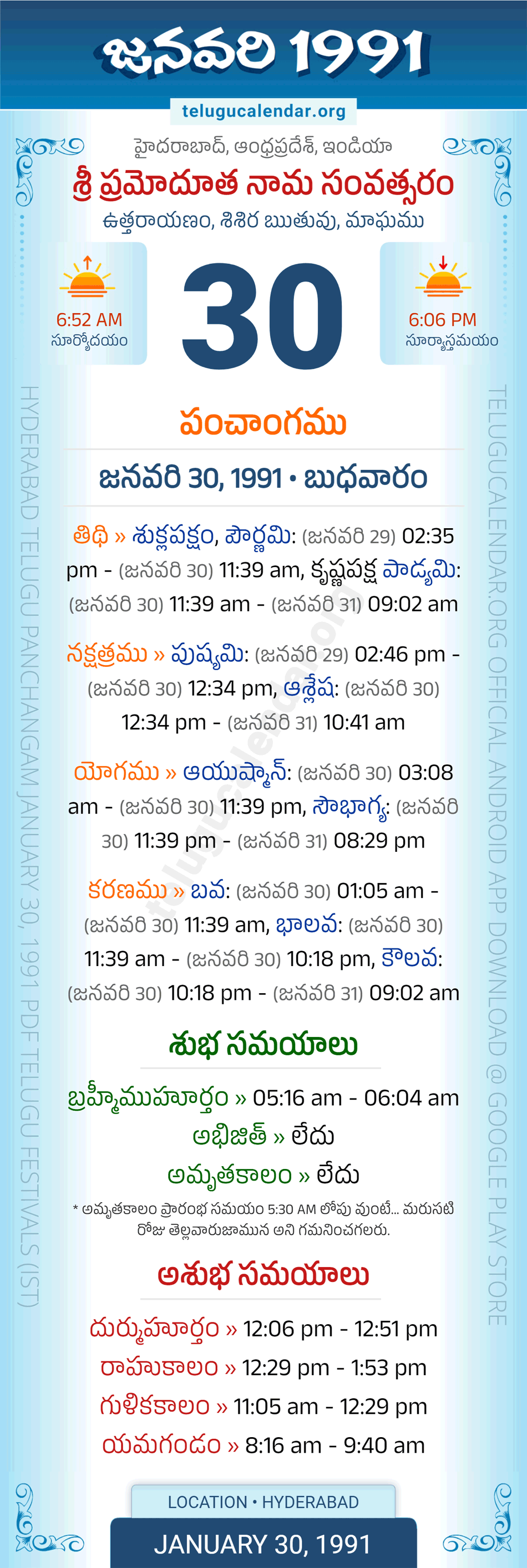 Download » January 30, 1991 » Hyderabad, Andhra Pradesh Telugu Calendar Panchangam Daily Sheet with Auspicious and Inauspicious Timings.