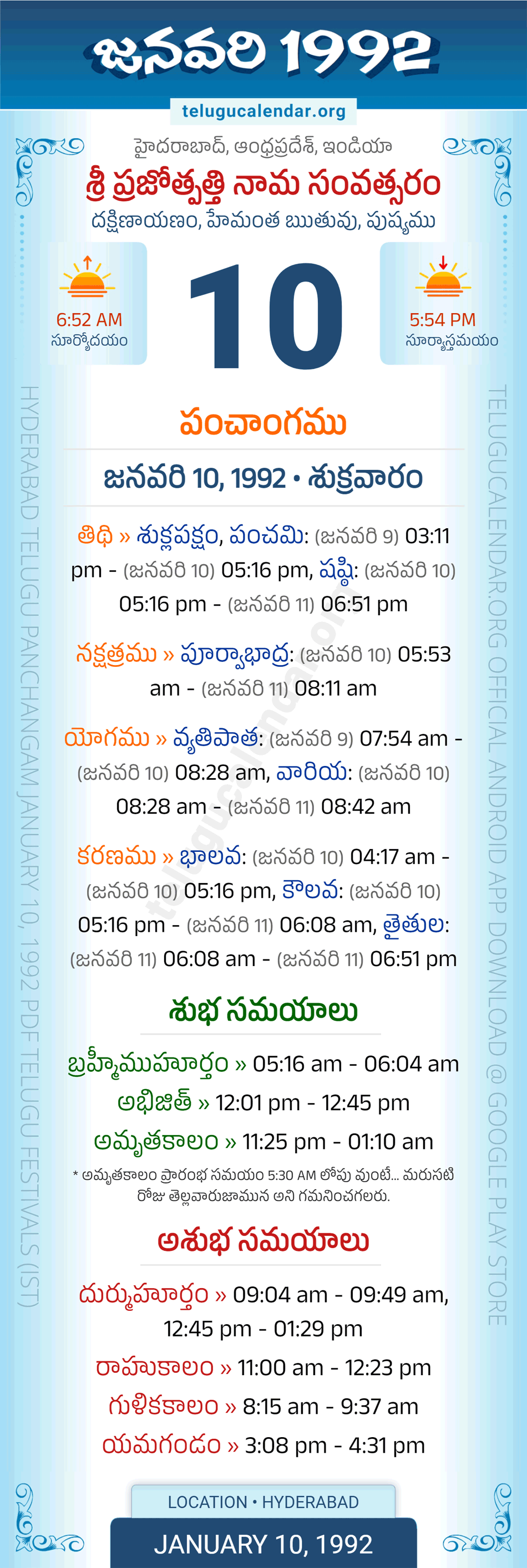 Download » January 10, 1992 » Hyderabad, Andhra Pradesh Telugu Calendar Panchangam Daily Sheet with Auspicious and Inauspicious Timings.