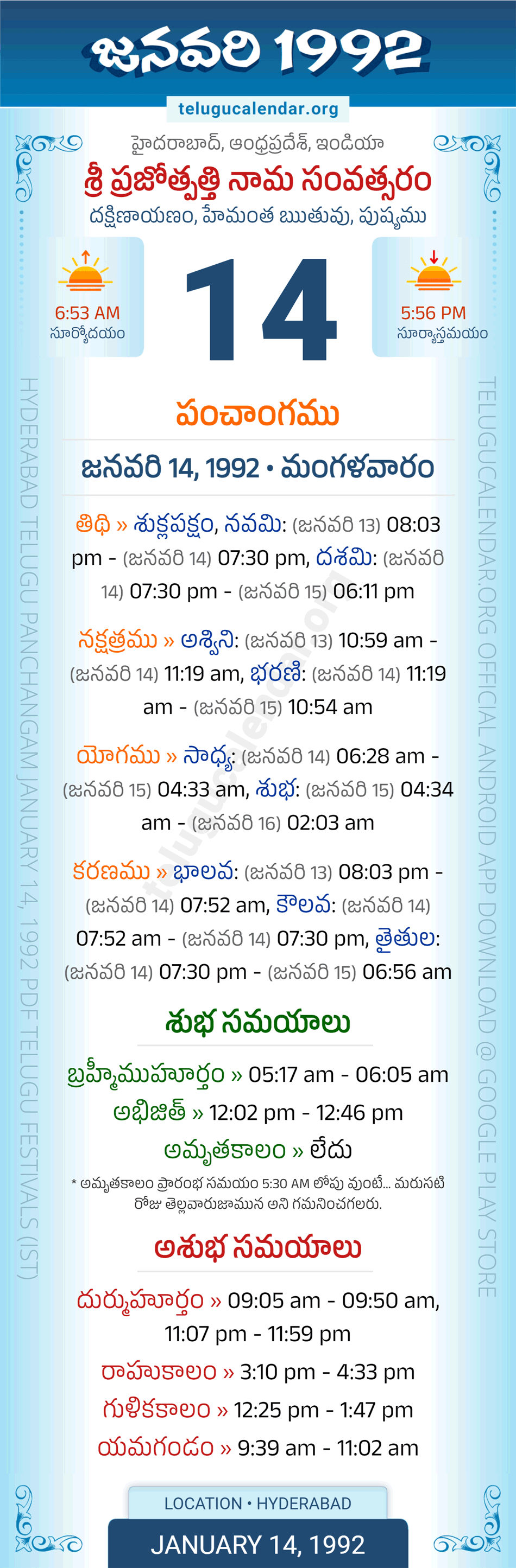 Download » January 14, 1992 » Hyderabad, Andhra Pradesh Telugu Calendar Panchangam Daily Sheet with Auspicious and Inauspicious Timings.