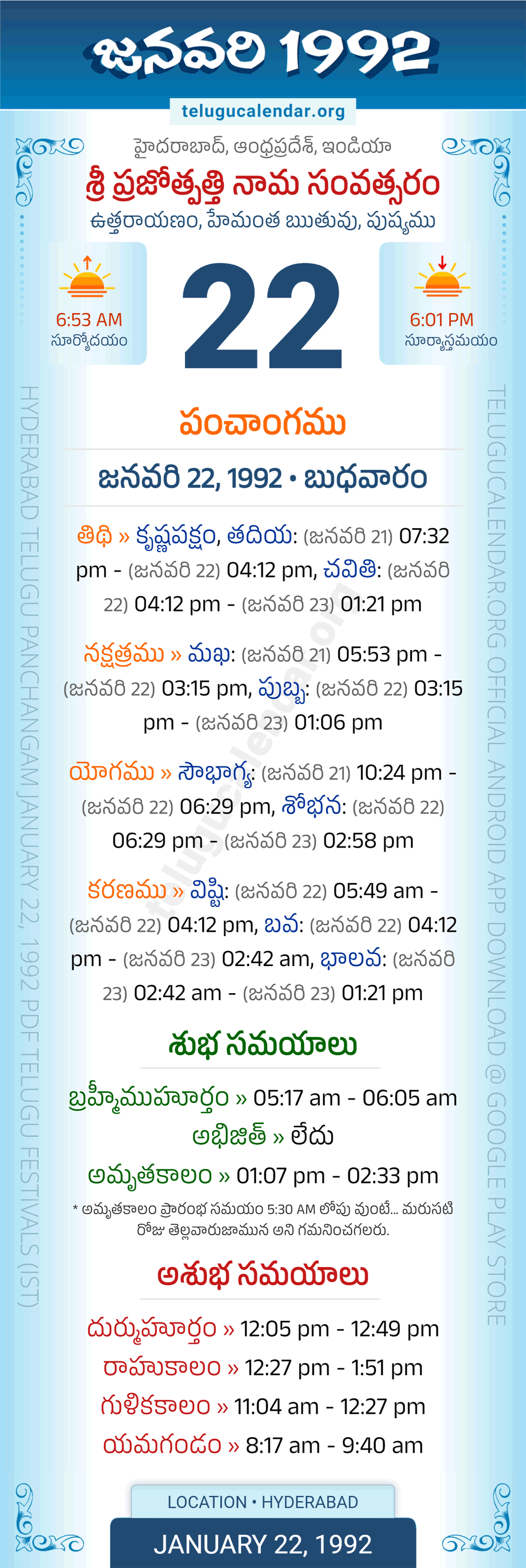 Download » January 22, 1992 » Hyderabad, Andhra Pradesh Telugu Calendar Panchangam Daily Sheet with Auspicious and Inauspicious Timings.