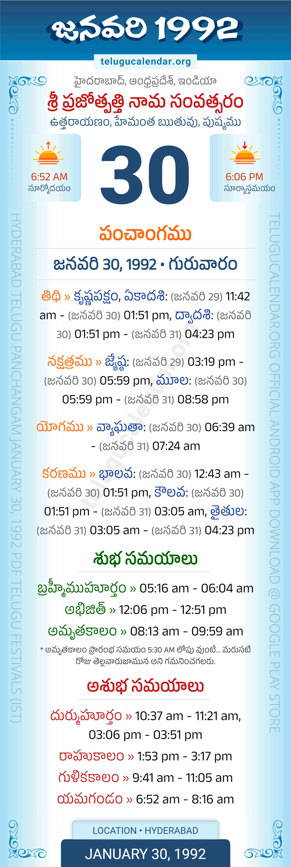 Download » January 30, 1992 » Hyderabad, Andhra Pradesh Telugu Calendar Panchangam Daily Sheet with Auspicious and Inauspicious Timings.