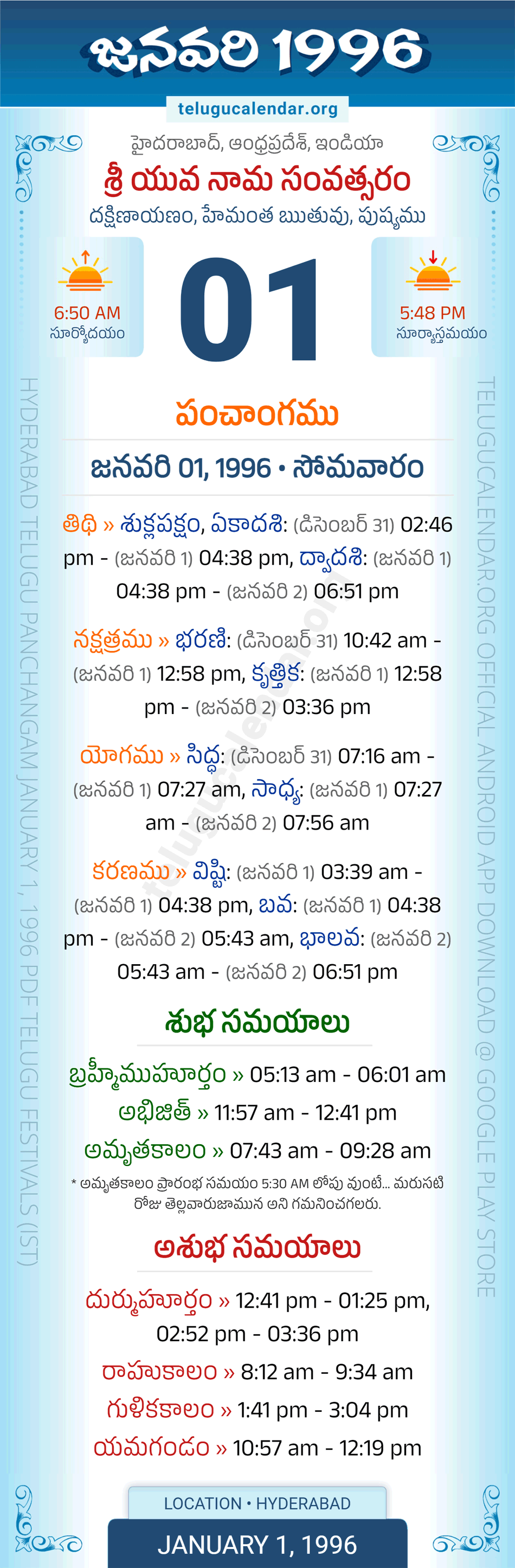 Apart from the Panchangam 1996, you can also find the Sunrise and Sunset (Middle Limb) timings, Paksham, Telugu Year, Yanam, Rutuvu, Telugu Month for Hyderabad. Auspicious Period January 1, 1996 for Hyderabad (Today Good Timings like Abhijit Muhurtham, Amruta Kalam & Brahma Muhurtham) and Inauspicious Period January 1, 1996 for Hyderabad (Bad Timings like Durmuhurtham, Rahukalam, Gulika kalam & Yamagandam) with starting and end timings in the above image in Telugu Language.