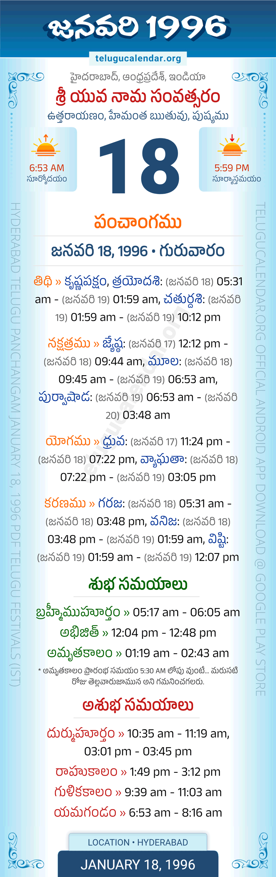Download » January 18, 1996 » Hyderabad, Andhra Pradesh Telugu Calendar Panchangam Daily Sheet with Auspicious and Inauspicious Timings.