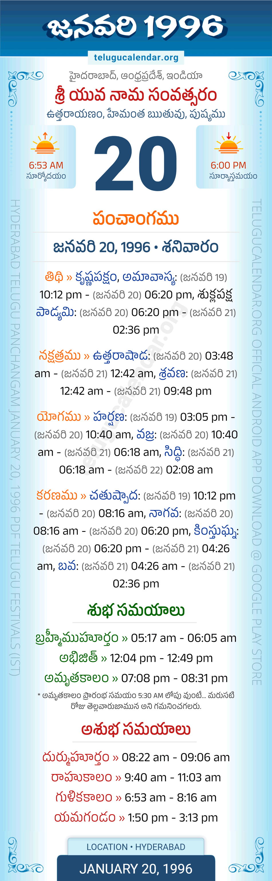 Download » January 20, 1996 » Hyderabad, Andhra Pradesh Telugu Calendar Panchangam Daily Sheet with Auspicious and Inauspicious Timings.