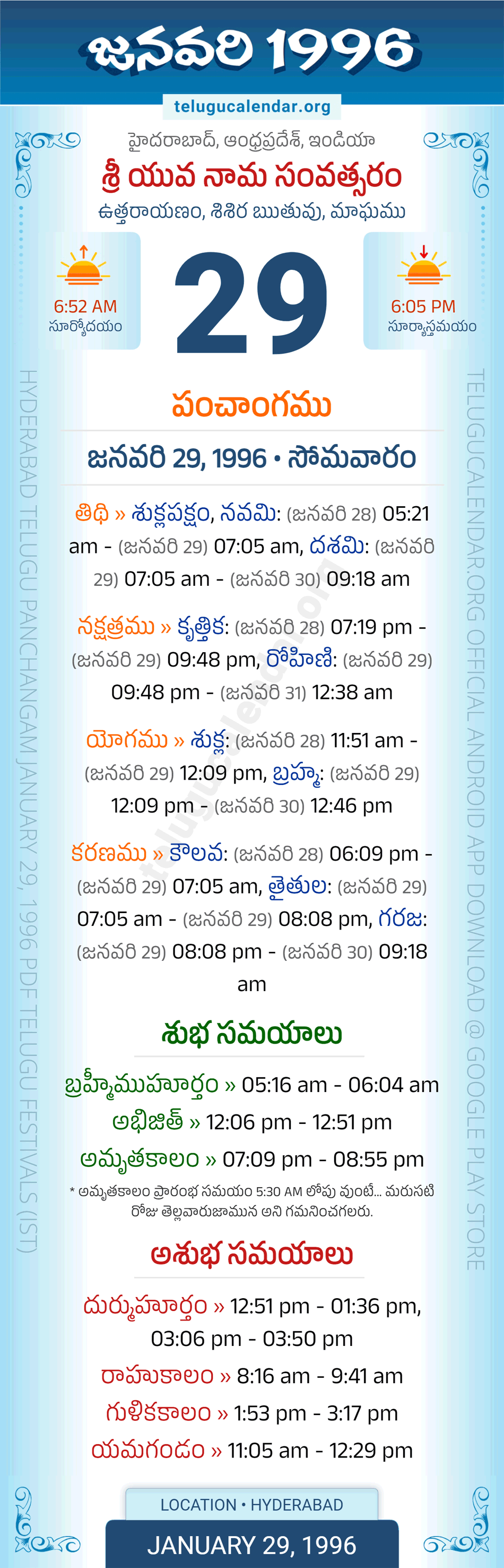 Download » January 29, 1996 » Hyderabad, Andhra Pradesh Telugu Calendar Panchangam Daily Sheet with Auspicious and Inauspicious Timings.
