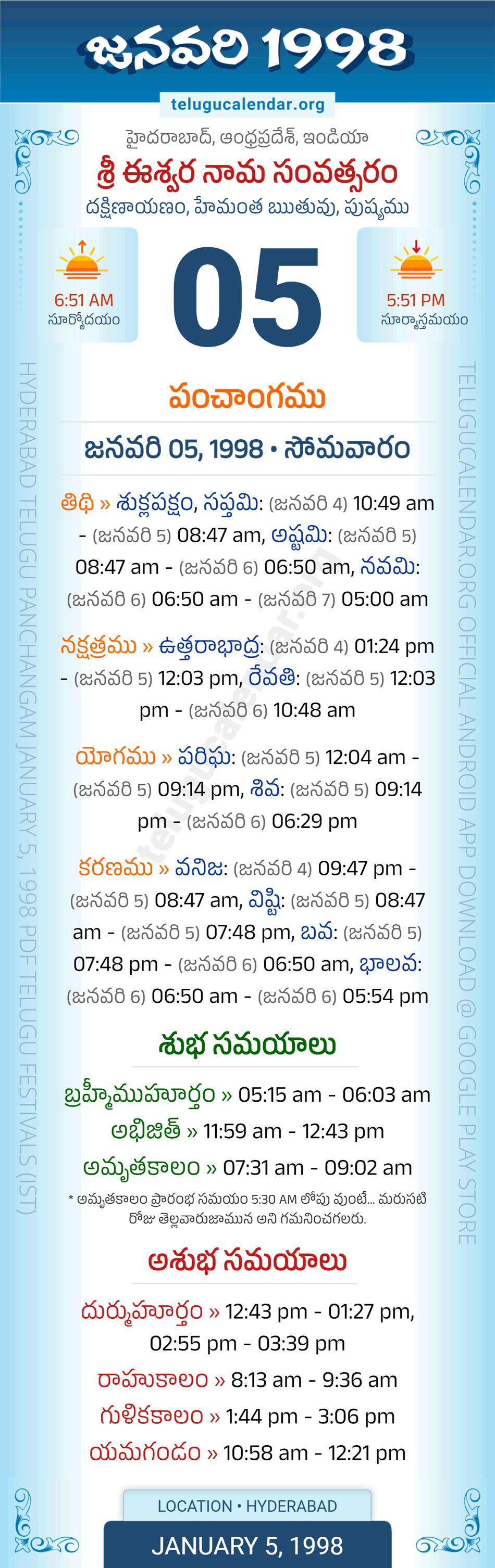 Download » January 5, 1998 » Hyderabad, Andhra Pradesh Telugu Calendar Panchangam Daily Sheet with Auspicious and Inauspicious Timings.