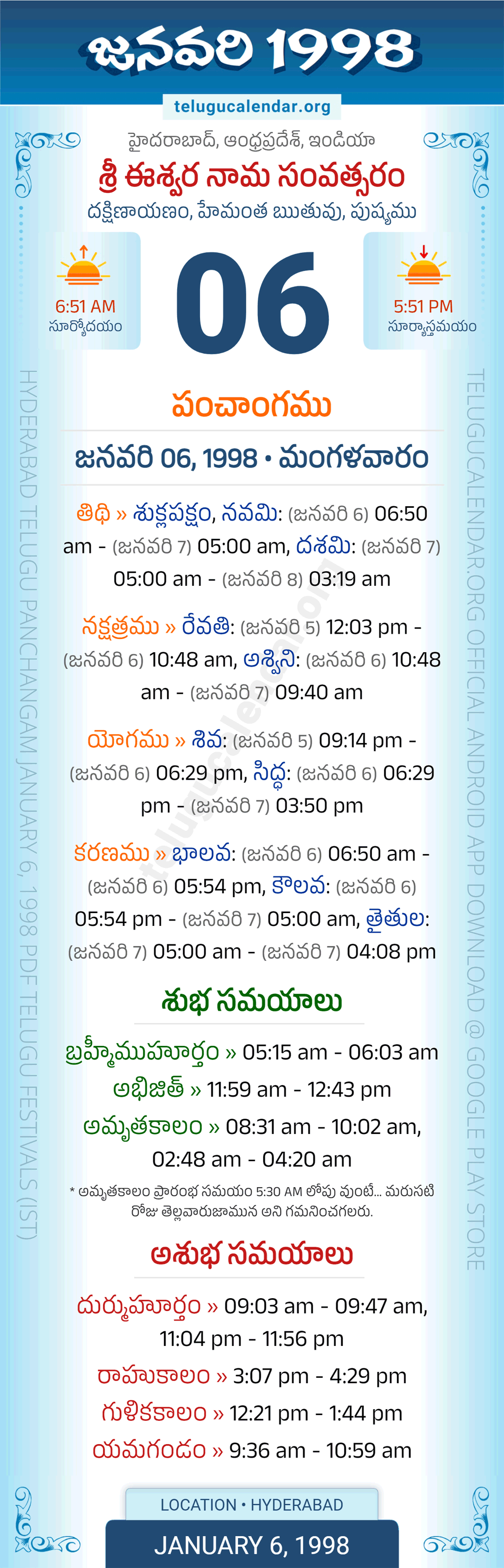 Download » January 6, 1998 » Hyderabad, Andhra Pradesh Telugu Calendar Panchangam Daily Sheet with Auspicious and Inauspicious Timings.