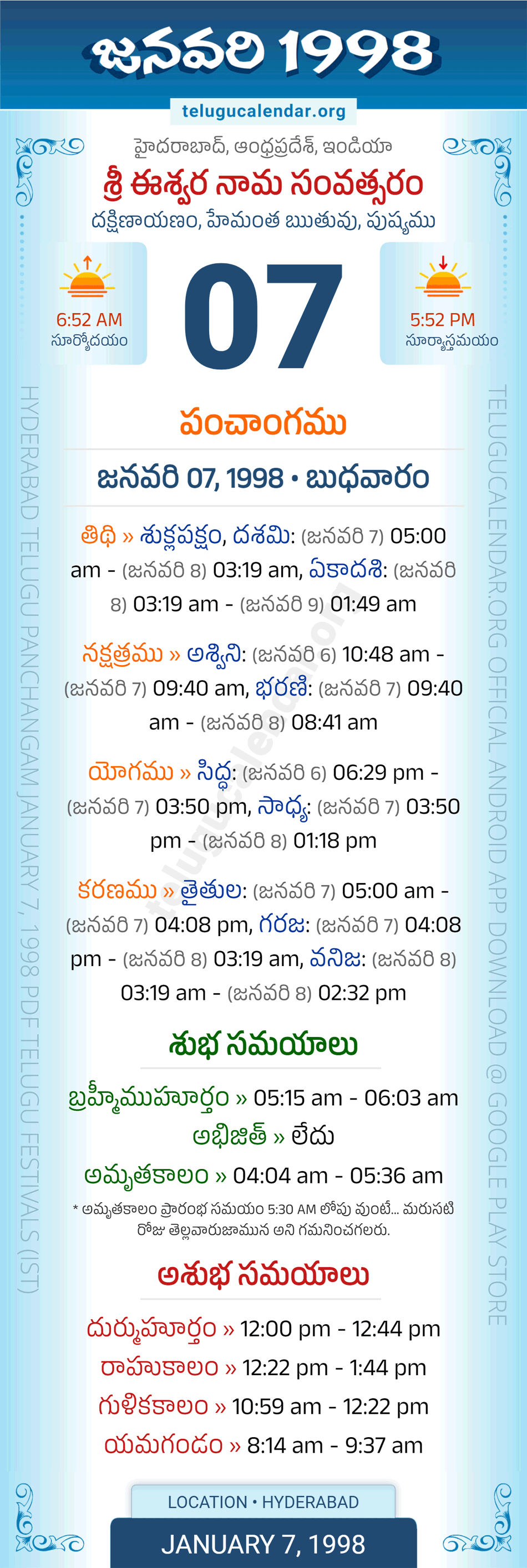 Download » January 7, 1998 » Hyderabad, Andhra Pradesh Telugu Calendar Panchangam Daily Sheet with Auspicious and Inauspicious Timings.