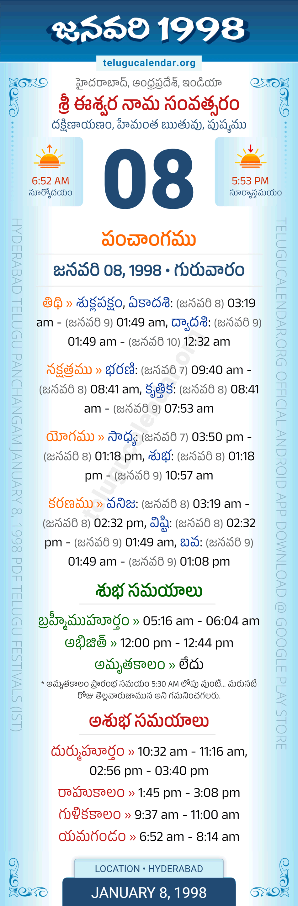 Download » January 8, 1998 » Hyderabad, Andhra Pradesh Telugu Calendar Panchangam Daily Sheet with Auspicious and Inauspicious Timings.