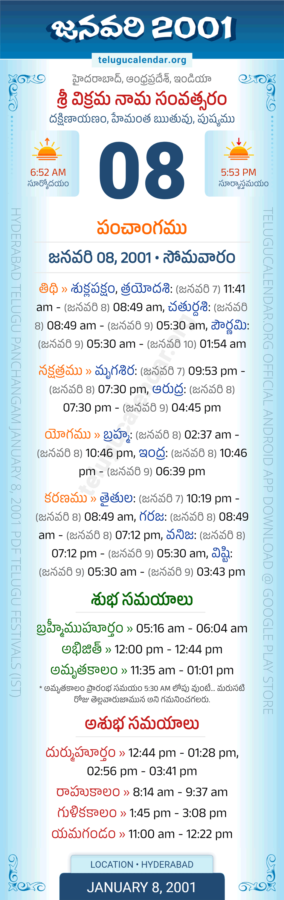 Download » January 8, 2001 » Hyderabad, Andhra Pradesh Telugu Calendar Panchangam Daily Sheet with Auspicious and Inauspicious Timings.