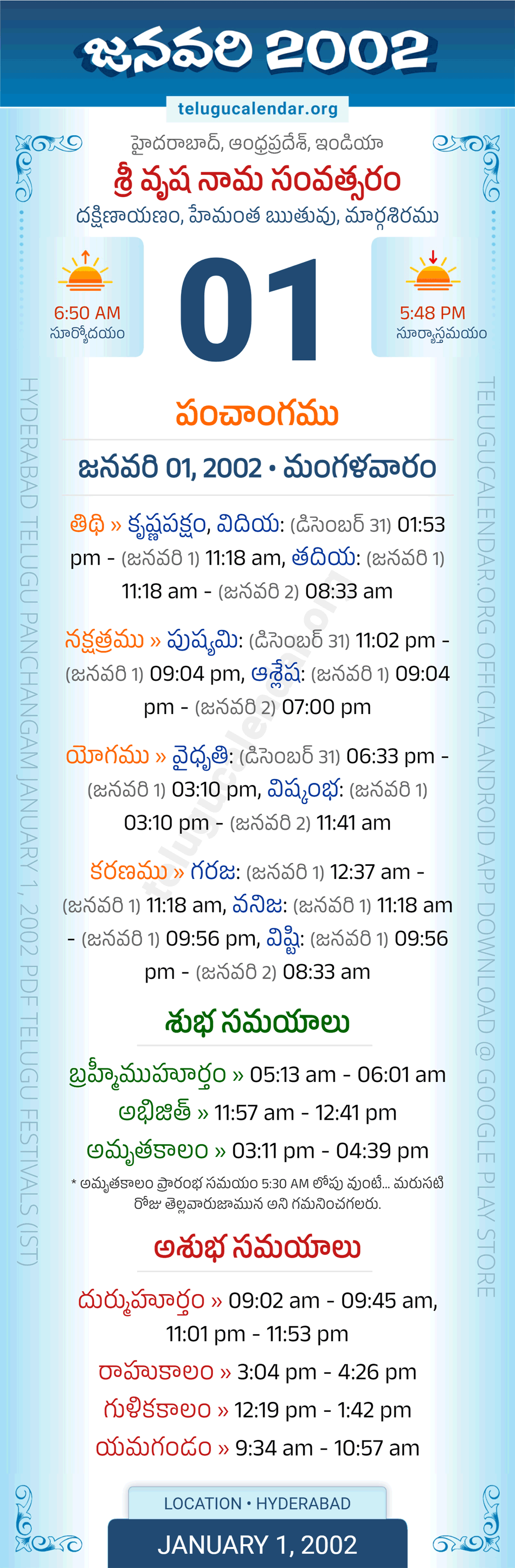 Download » January 1, 2002 » Hyderabad, Andhra Pradesh Telugu Calendar Panchangam Daily Sheet with Auspicious and Inauspicious Timings.