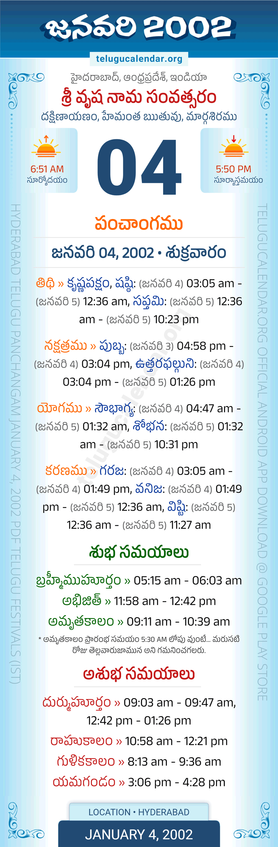 Download » January 4, 2002 » Hyderabad, Andhra Pradesh Telugu Calendar Panchangam Daily Sheet with Auspicious and Inauspicious Timings.
