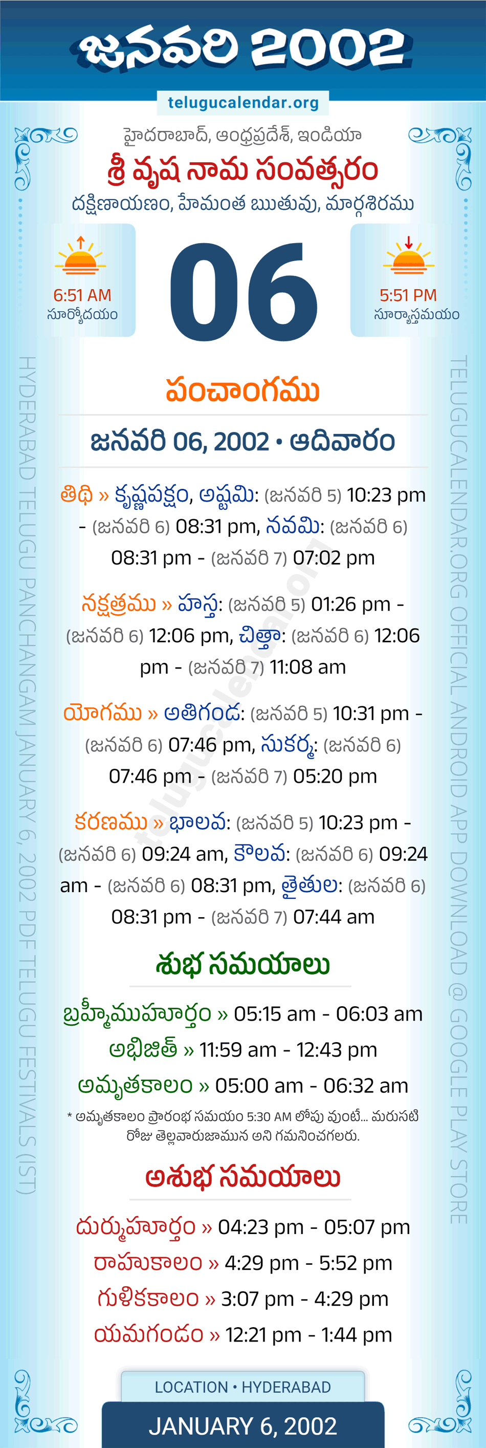 Download » January 6, 2002 » Hyderabad, Andhra Pradesh Telugu Calendar Panchangam Daily Sheet with Auspicious and Inauspicious Timings.