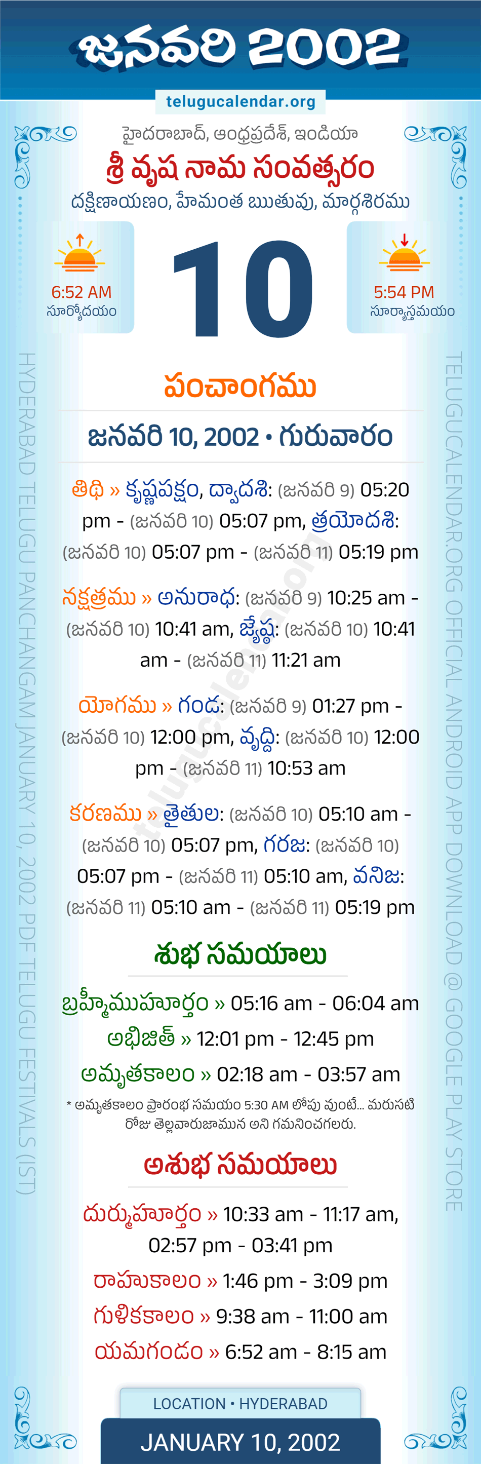 Download » January 10, 2002 » Hyderabad, Andhra Pradesh Telugu Calendar Panchangam Daily Sheet with Auspicious and Inauspicious Timings.