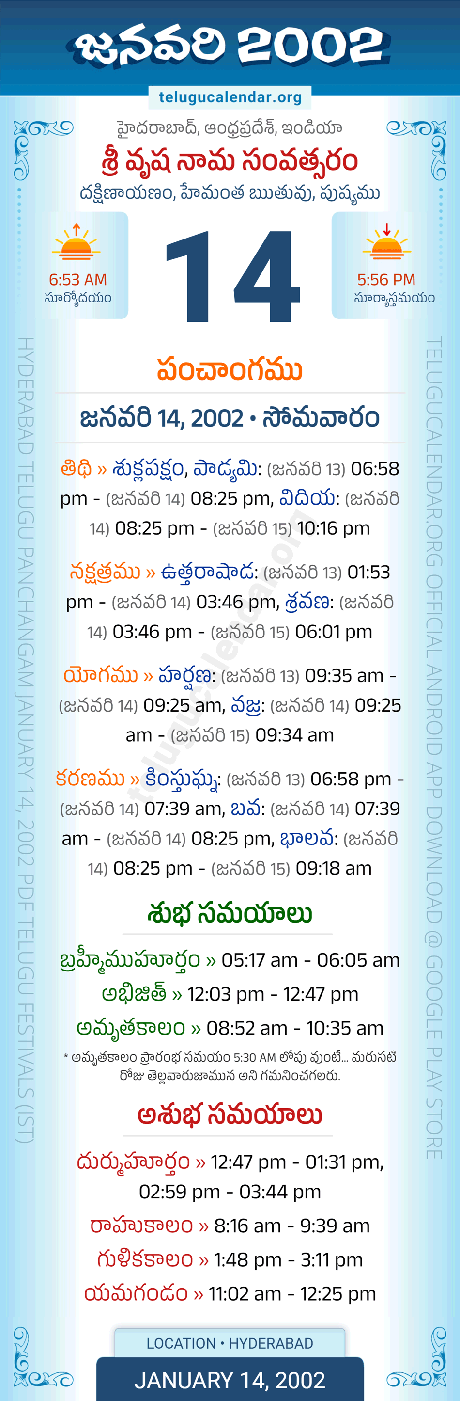 Apart from the Panchangam 2002, you can also find the Sunrise and Sunset (Middle Limb) timings, Paksham, Telugu Year, Yanam, Rutuvu, Telugu Month for Hyderabad. Auspicious Period January 14, 2002 for Hyderabad (Today Good Timings like Abhijit Muhurtham, Amruta Kalam & Brahma Muhurtham) and Inauspicious Period January 14, 2002 for Hyderabad (Bad Timings like Durmuhurtham, Rahukalam, Gulika kalam & Yamagandam) with starting and end timings in the above image in Telugu Language.