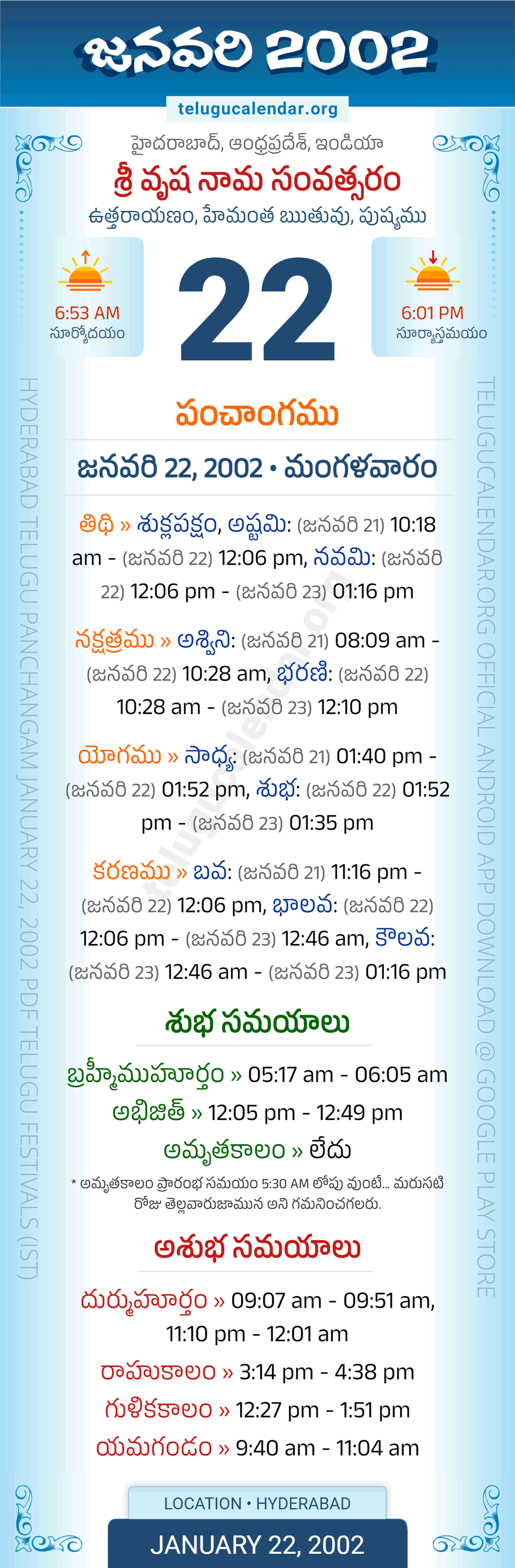 Download » January 22, 2002 » Hyderabad, Andhra Pradesh Telugu Calendar Panchangam Daily Sheet with Auspicious and Inauspicious Timings.