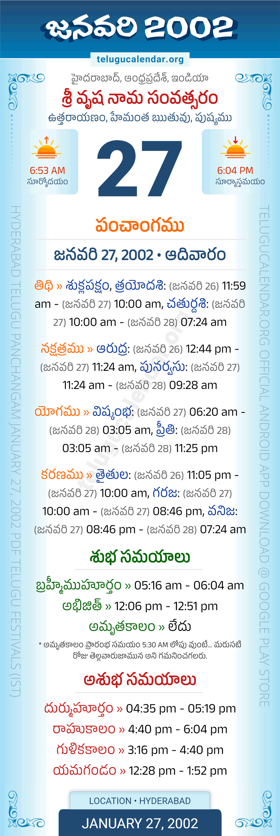 Apart from the Panchangam 2002, you can also find the Sunrise and Sunset (Middle Limb) timings, Paksham, Telugu Year, Yanam, Rutuvu, Telugu Month for Hyderabad. Auspicious Period January 27, 2002 for Hyderabad (Today Good Timings like Abhijit Muhurtham, Amruta Kalam & Brahma Muhurtham) and Inauspicious Period January 27, 2002 for Hyderabad (Bad Timings like Durmuhurtham, Rahukalam, Gulika kalam & Yamagandam) with starting and end timings in the above image in Telugu Language.