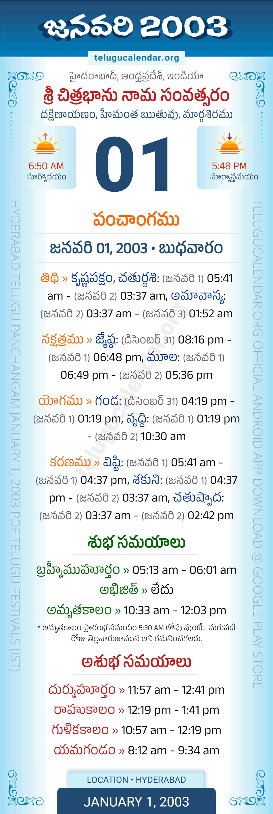 Download » January 1, 2003 » Hyderabad, Andhra Pradesh Telugu Calendar Panchangam Daily Sheet with Auspicious and Inauspicious Timings.