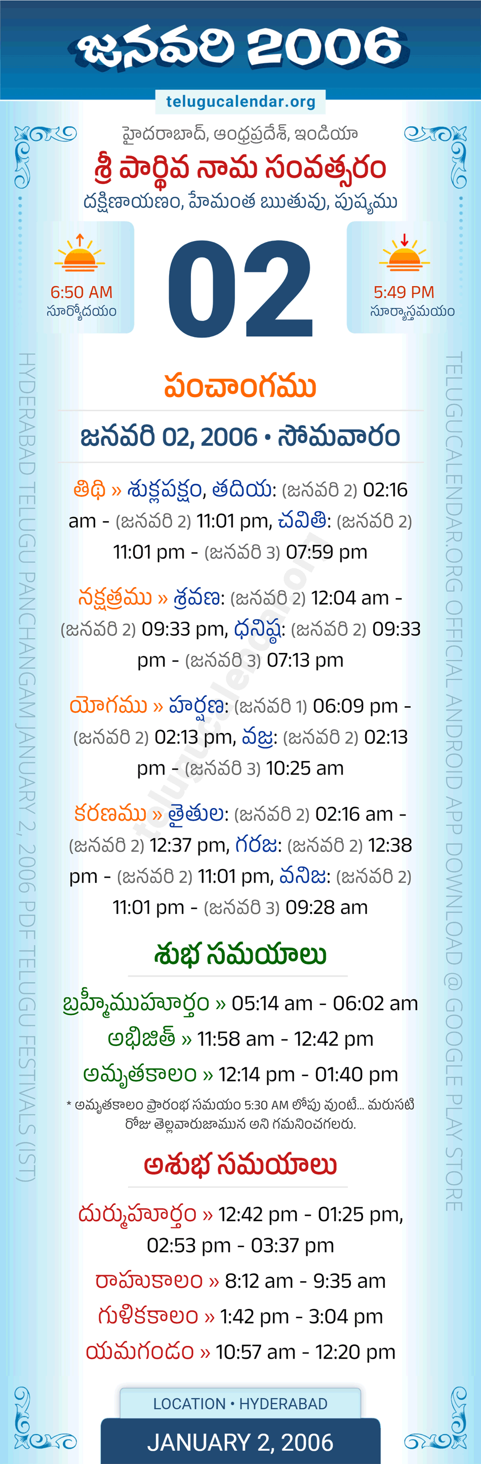 Download » January 2, 2006 » Hyderabad, Andhra Pradesh Telugu Calendar Panchangam Daily Sheet with Auspicious and Inauspicious Timings.