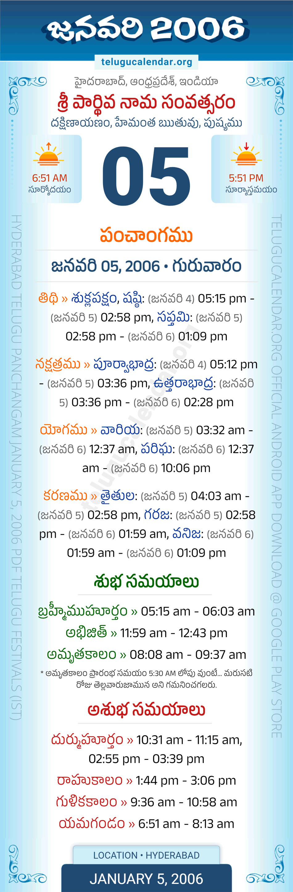 Download » January 5, 2006 » Hyderabad, Andhra Pradesh Telugu Calendar Panchangam Daily Sheet with Auspicious and Inauspicious Timings.