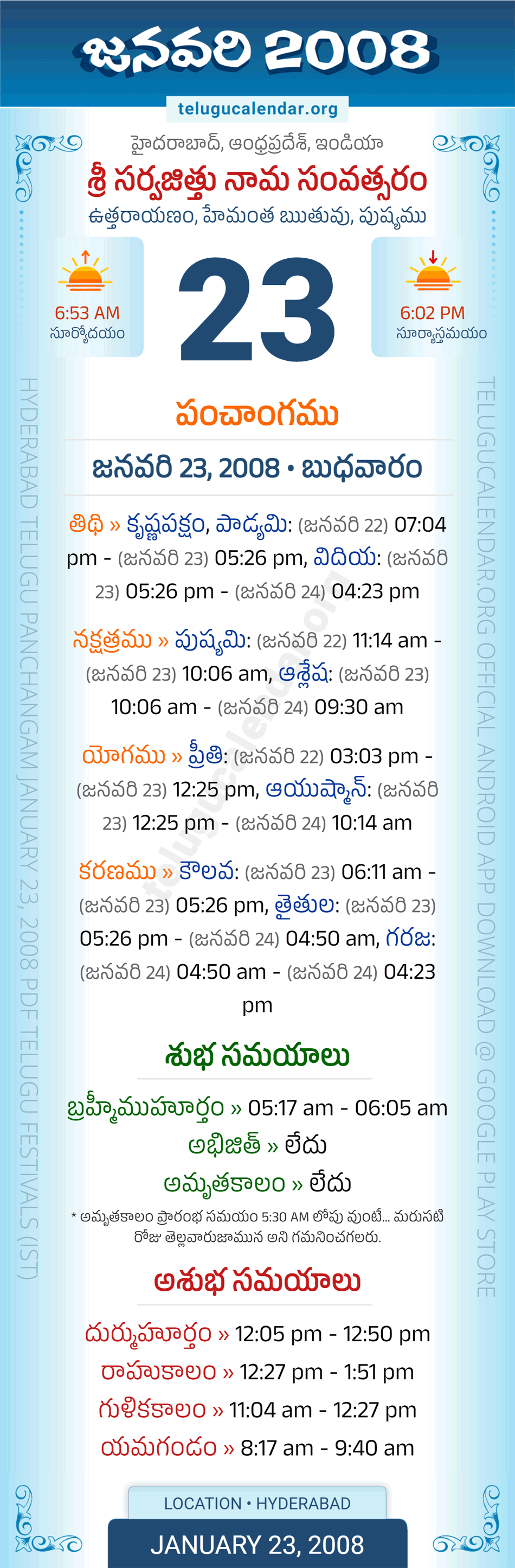 Download » January 23, 2008 » Hyderabad, Andhra Pradesh Telugu Calendar Panchangam Daily Sheet with Auspicious and Inauspicious Timings.