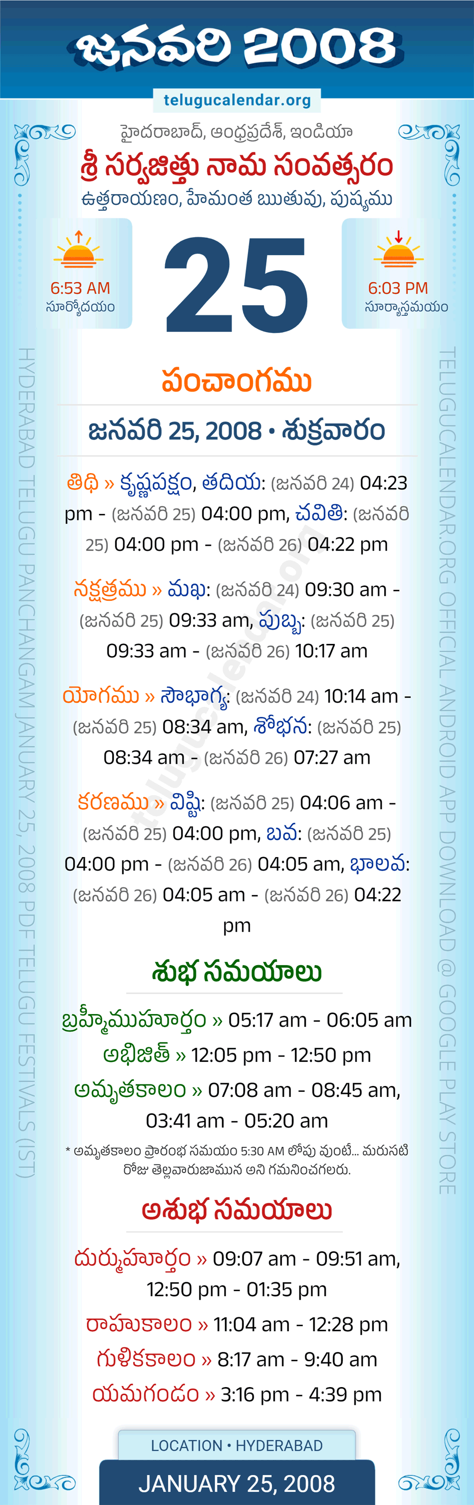 Download » January 25, 2008 » Hyderabad, Andhra Pradesh Telugu Calendar Panchangam Daily Sheet with Auspicious and Inauspicious Timings.