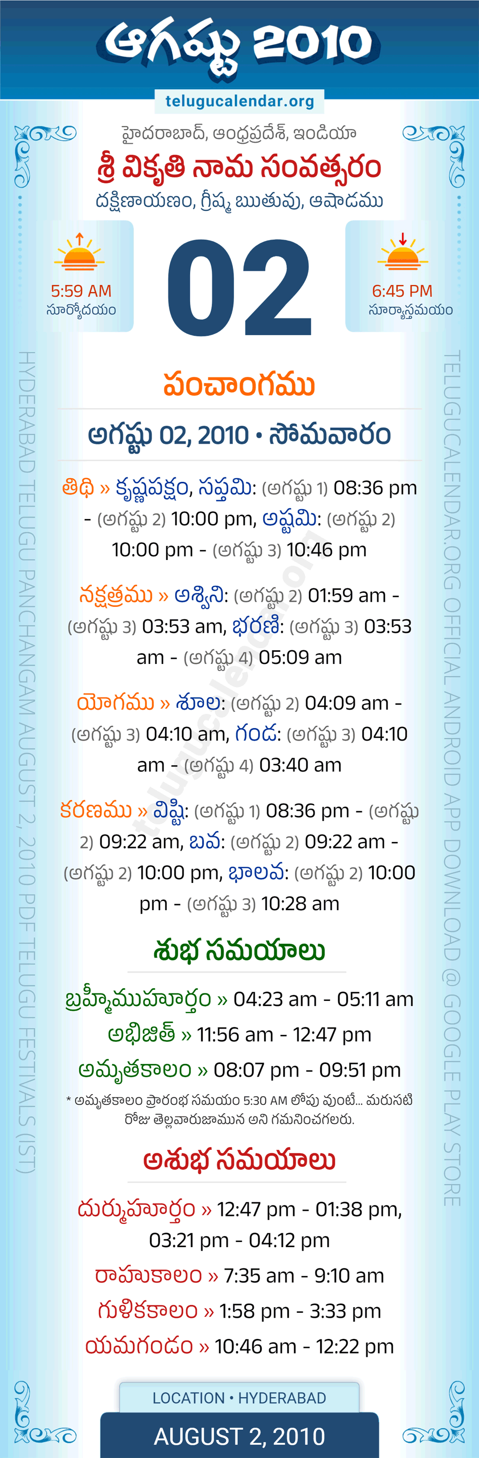 Download » August 2, 2010 » Hyderabad, Andhra Pradesh Telugu Calendar Panchangam Daily Sheet with Auspicious and Inauspicious Timings.