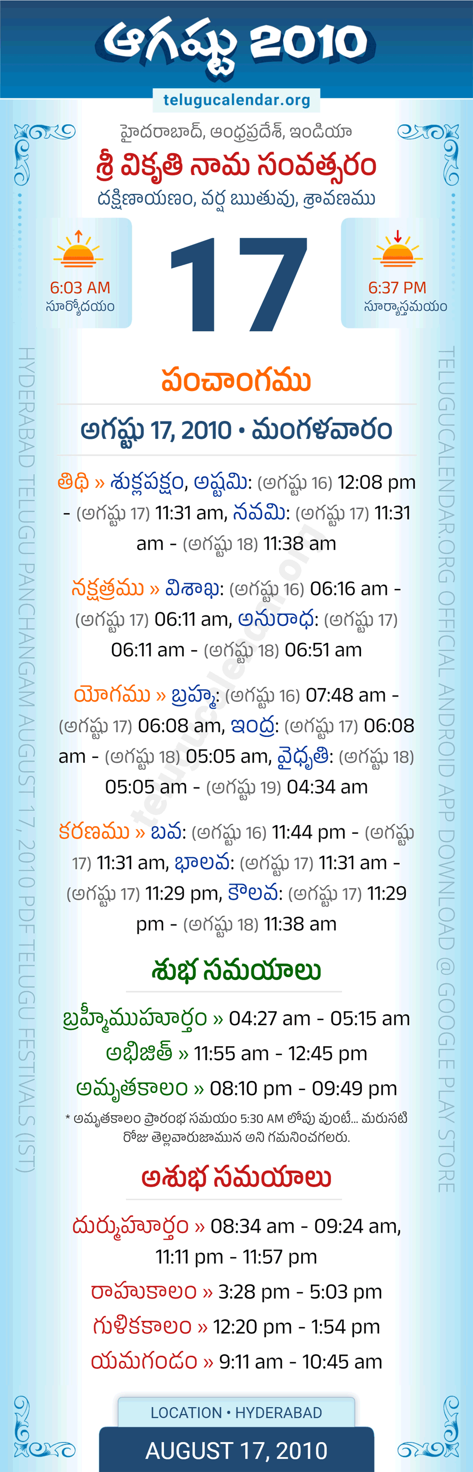 Download » August 17, 2010 » Hyderabad, Andhra Pradesh Telugu Calendar Panchangam Daily Sheet with Auspicious and Inauspicious Timings.