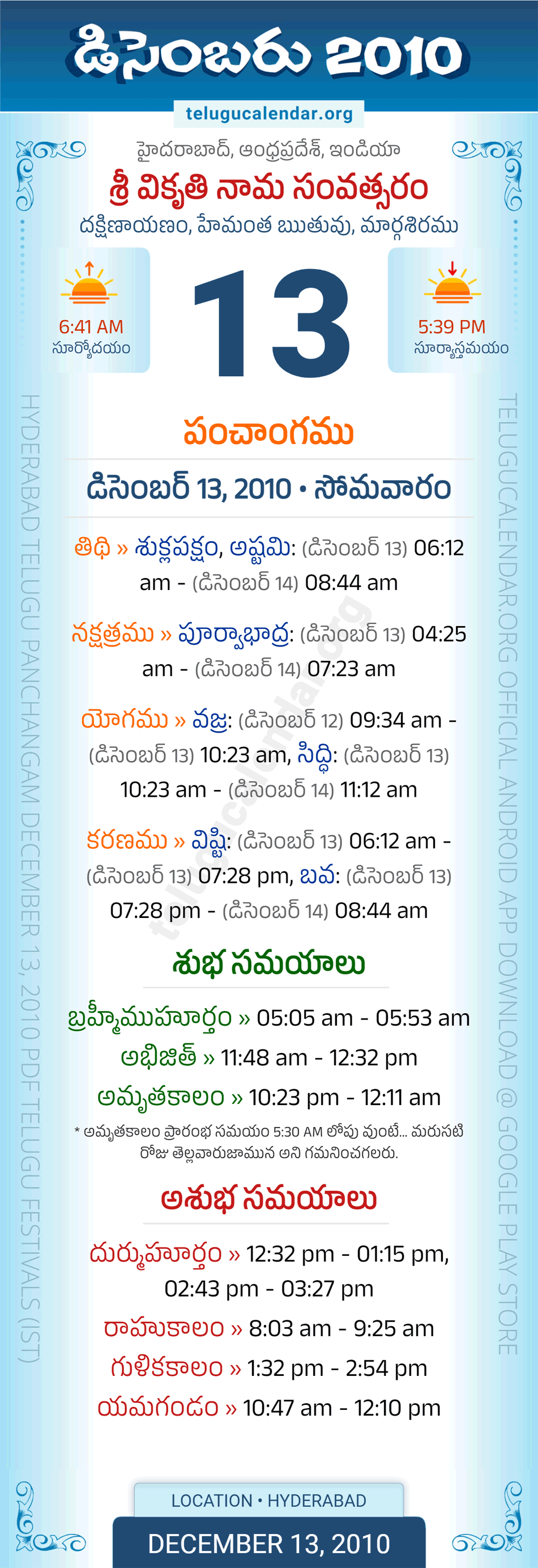 Download » December 13, 2010 » Hyderabad, Andhra Pradesh Telugu Calendar Panchangam Daily Sheet with Auspicious and Inauspicious Timings.