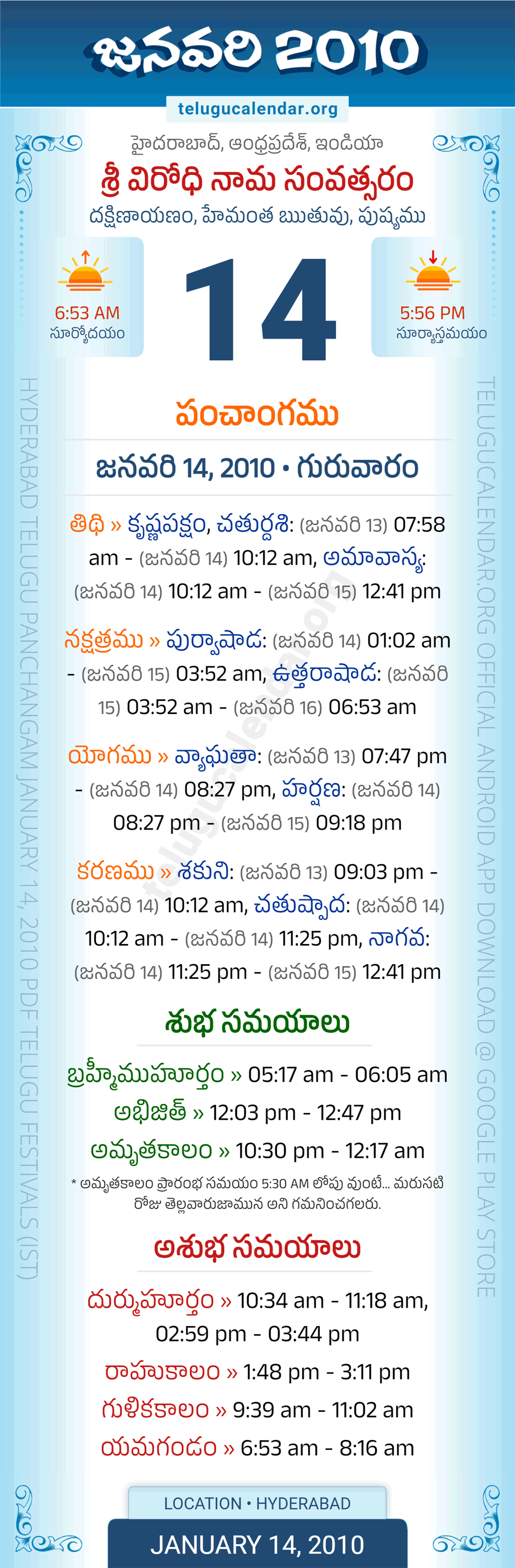 Download » January 14, 2010 » Hyderabad, Andhra Pradesh Telugu Calendar Panchangam Daily Sheet with Auspicious and Inauspicious Timings.