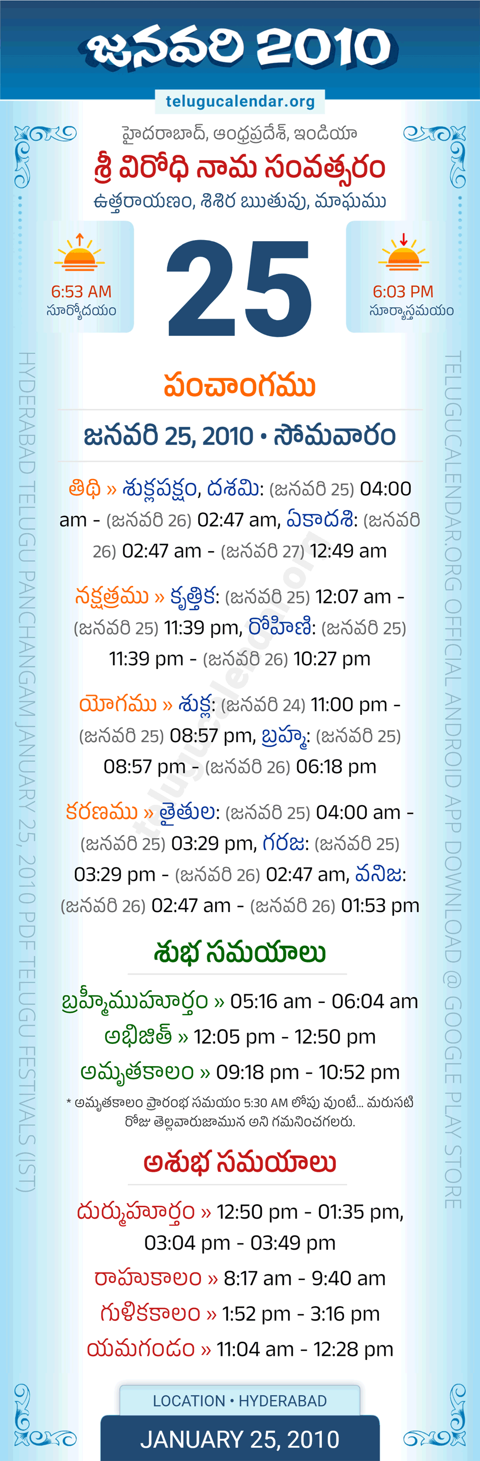 Download » January 25, 2010 » Hyderabad, Andhra Pradesh Telugu Calendar Panchangam Daily Sheet with Auspicious and Inauspicious Timings.