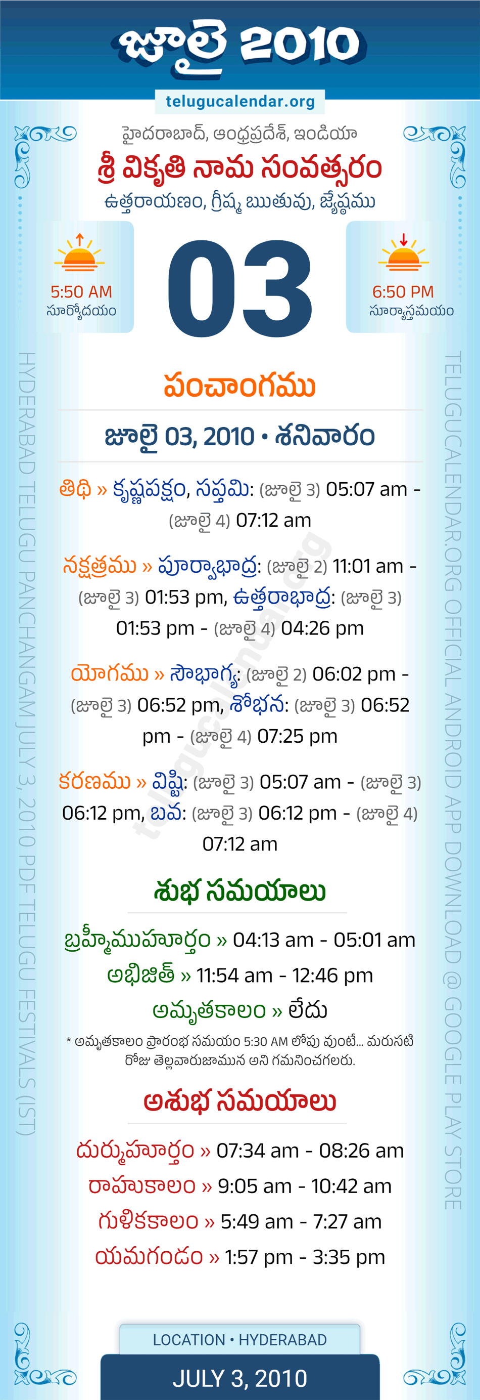 Download » July 3, 2010 » Hyderabad, Andhra Pradesh Telugu Calendar Panchangam Daily Sheet with Auspicious and Inauspicious Timings.
