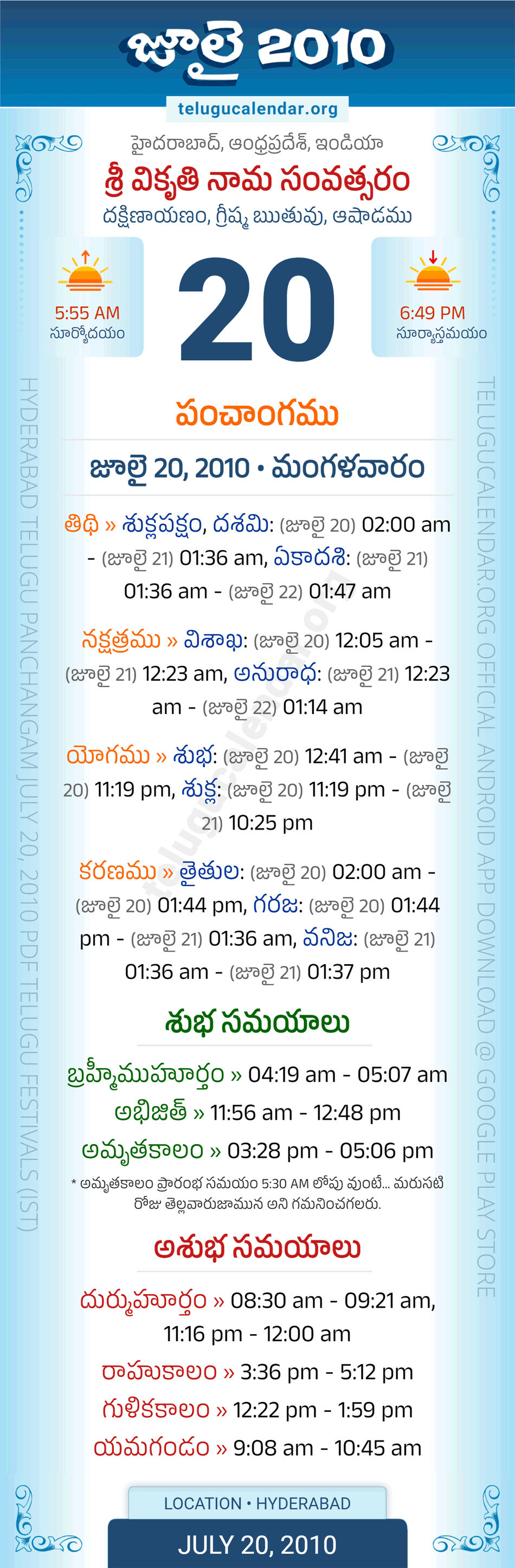 Download » July 20, 2010 » Hyderabad, Andhra Pradesh Telugu Calendar Panchangam Daily Sheet with Auspicious and Inauspicious Timings.