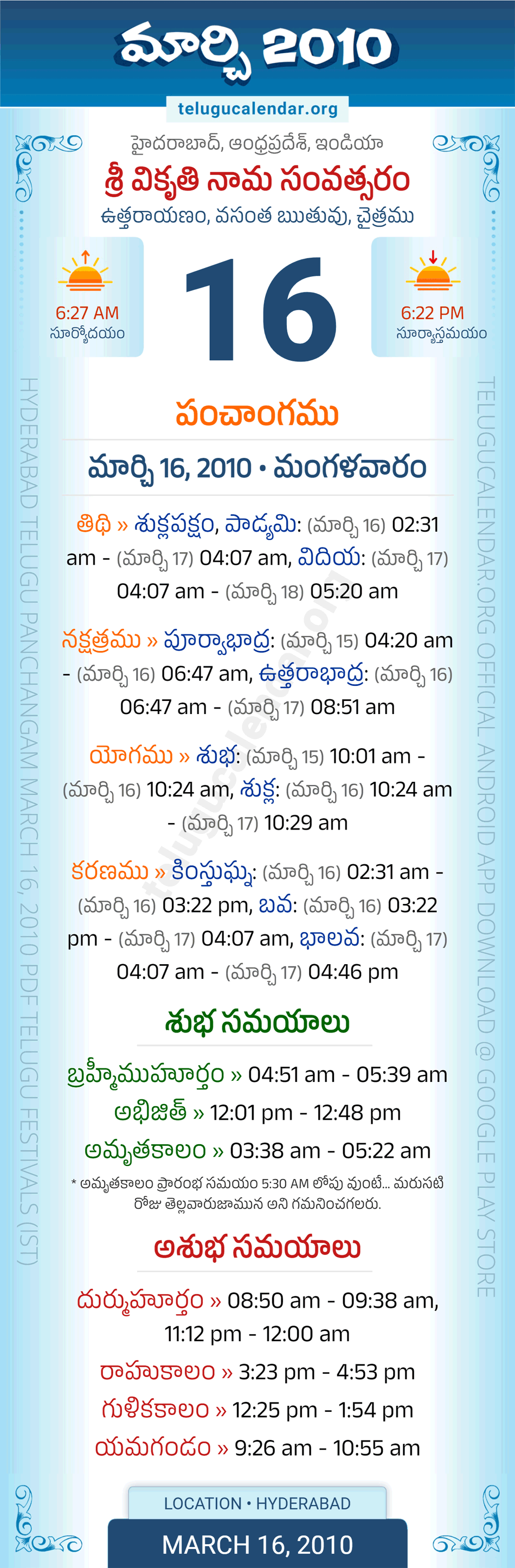 Download » March 16, 2010 » Hyderabad, Andhra Pradesh Telugu Calendar Panchangam Daily Sheet with Auspicious and Inauspicious Timings.