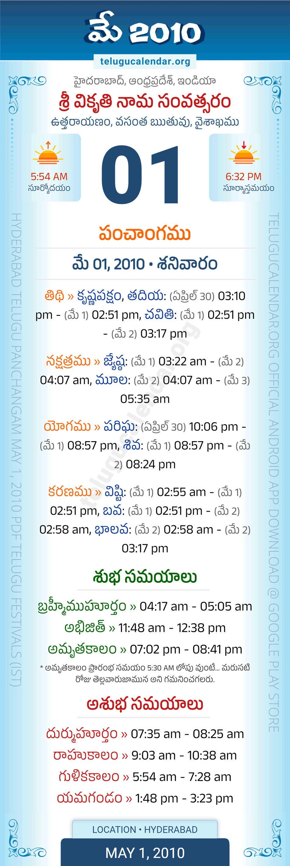 Download » May 1, 2010 » Hyderabad, Andhra Pradesh Telugu Calendar Panchangam Daily Sheet with Auspicious and Inauspicious Timings.