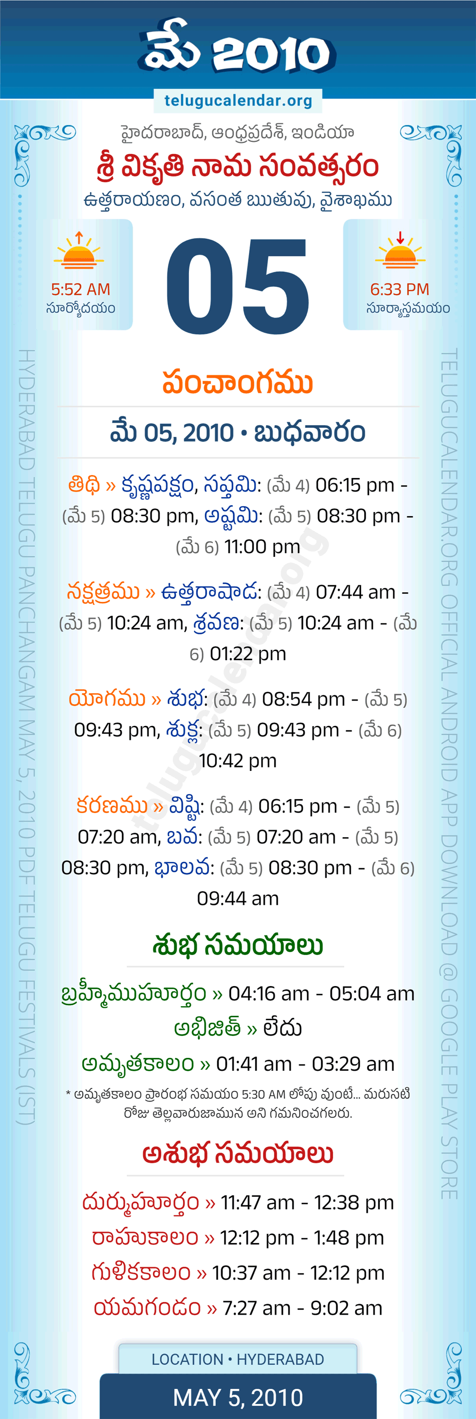 Download » May 5, 2010 » Hyderabad, Andhra Pradesh Telugu Calendar Panchangam Daily Sheet with Auspicious and Inauspicious Timings.
