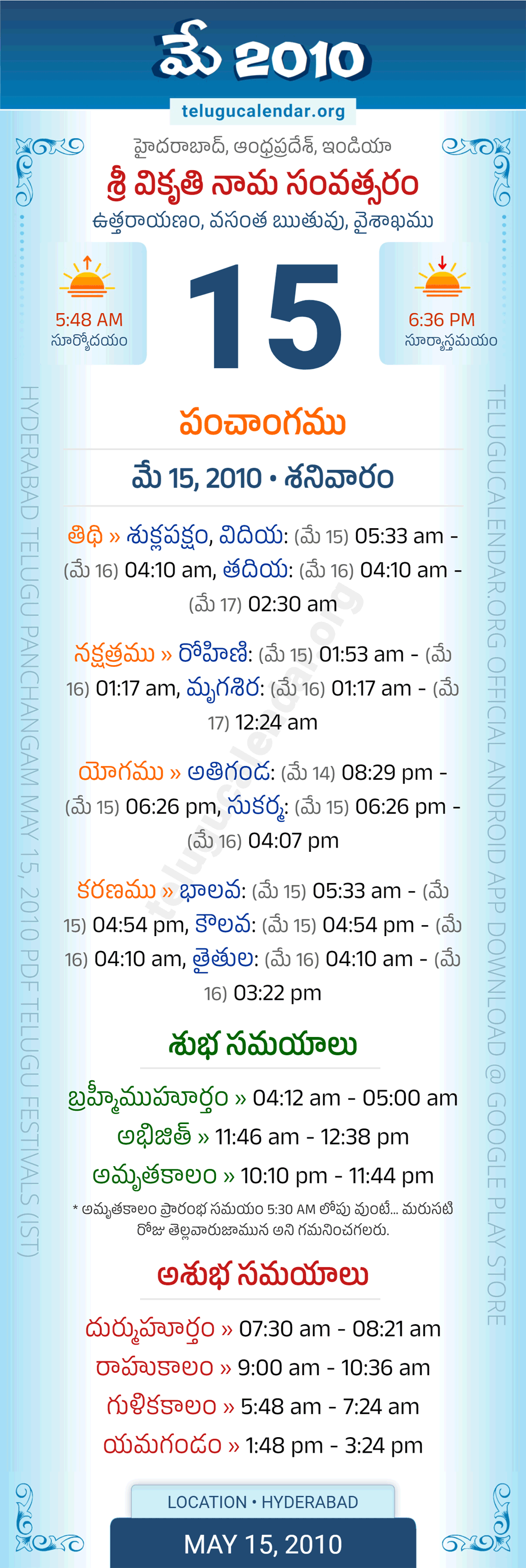 Download » May 15, 2010 » Hyderabad, Andhra Pradesh Telugu Calendar Panchangam Daily Sheet with Auspicious and Inauspicious Timings.