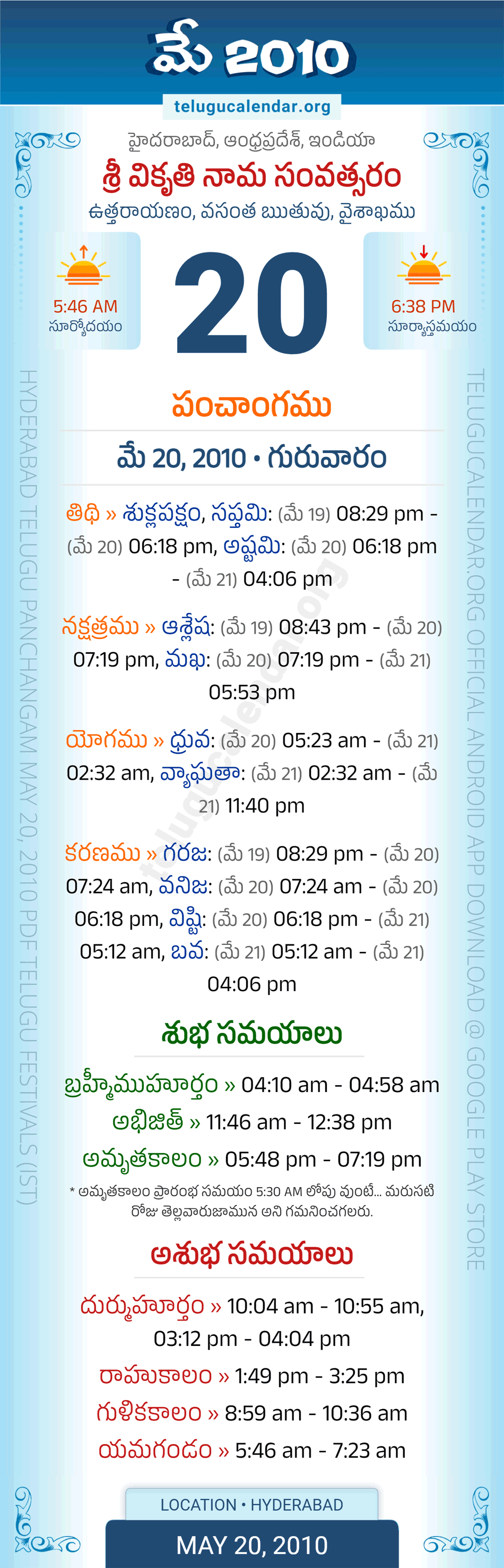 Download » May 20, 2010 » Hyderabad, Andhra Pradesh Telugu Calendar Panchangam Daily Sheet with Auspicious and Inauspicious Timings.